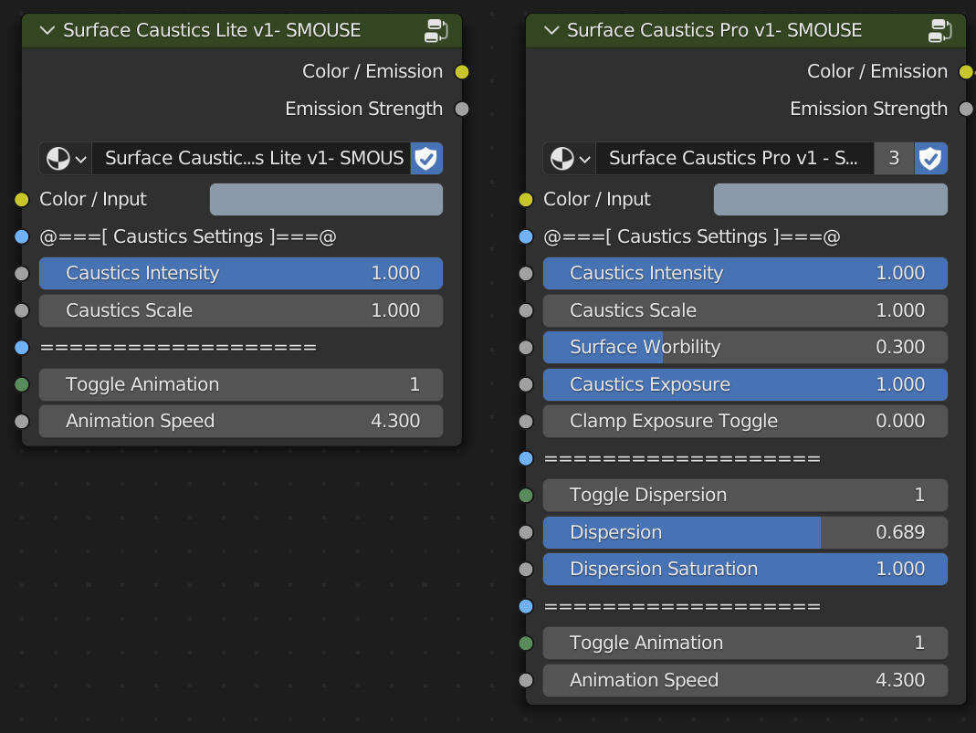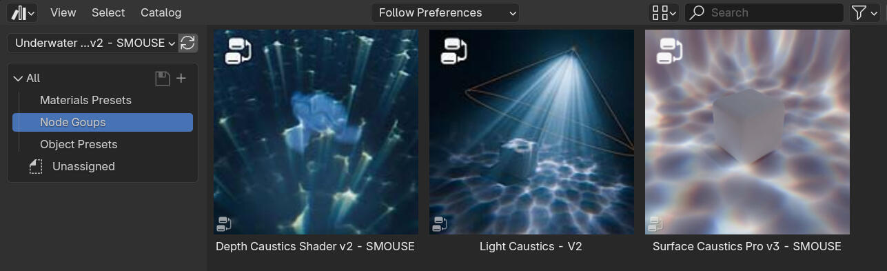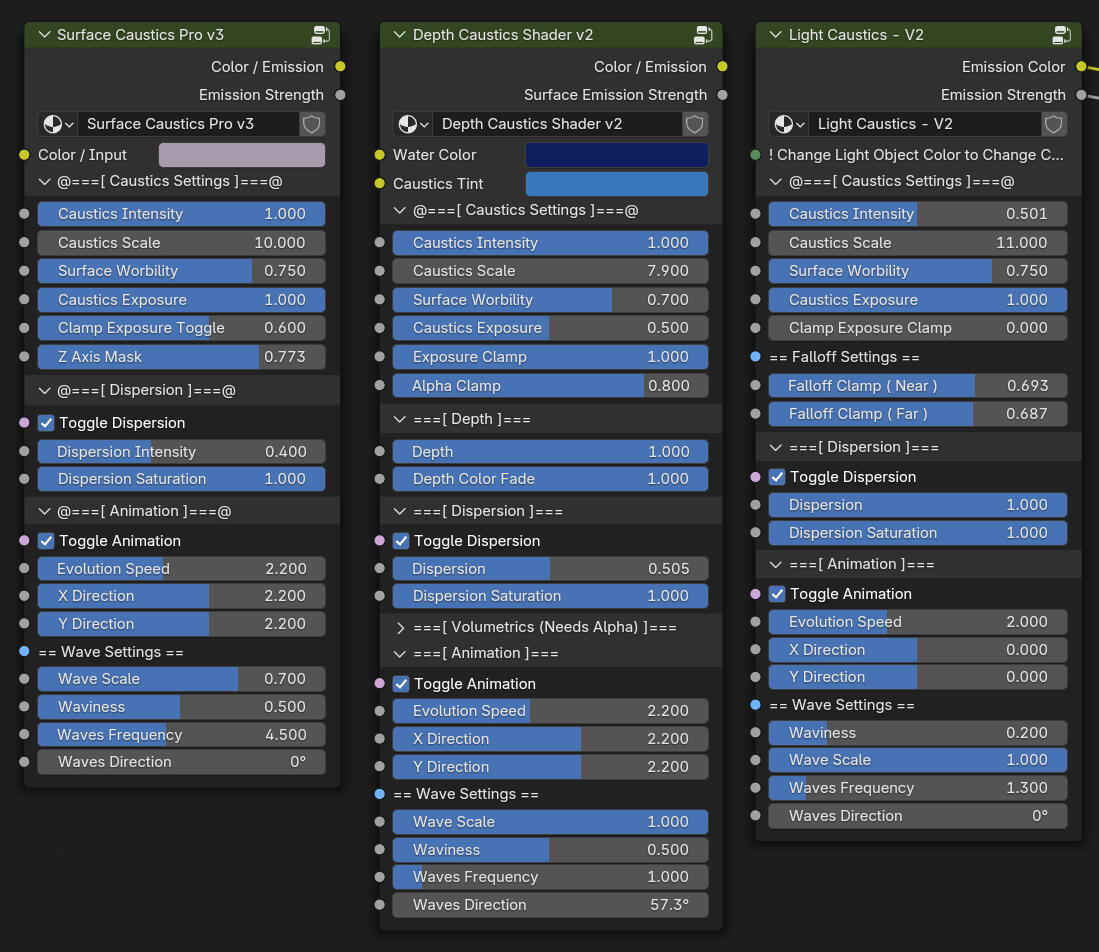 This new update introduces a suite of new features, including...+ Updated Node Group UI (Panel Organization)+ Added "Wave Animation" settings to all caustics types+ Added "Material Presets, Node Groups, Object Presets" categories to the Asset Library, for dragging and dropping in any scenario.+ Added "Falloff Settings" to the Caustics Light Object; Clamp the start and end positions of the lights influence. (Best results when used within Volumetric Environments)+ Added Blur Settings (Falloff Blur for Light Nodes)(This works in Eevee & Cycles; Light Presets are Cycles only)
